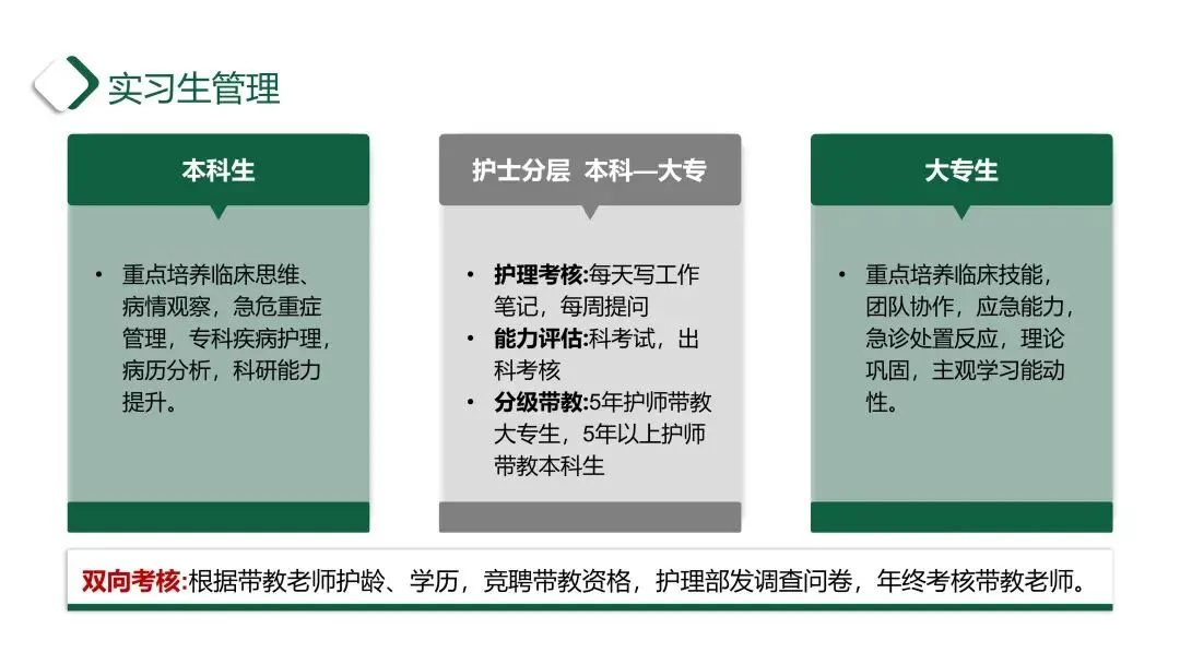 💼实习生管理中,本科生重点培养临床思维等能力,大专生重点培养临床技能等能力,护士分层带教且通过双向考核管理带教老师。