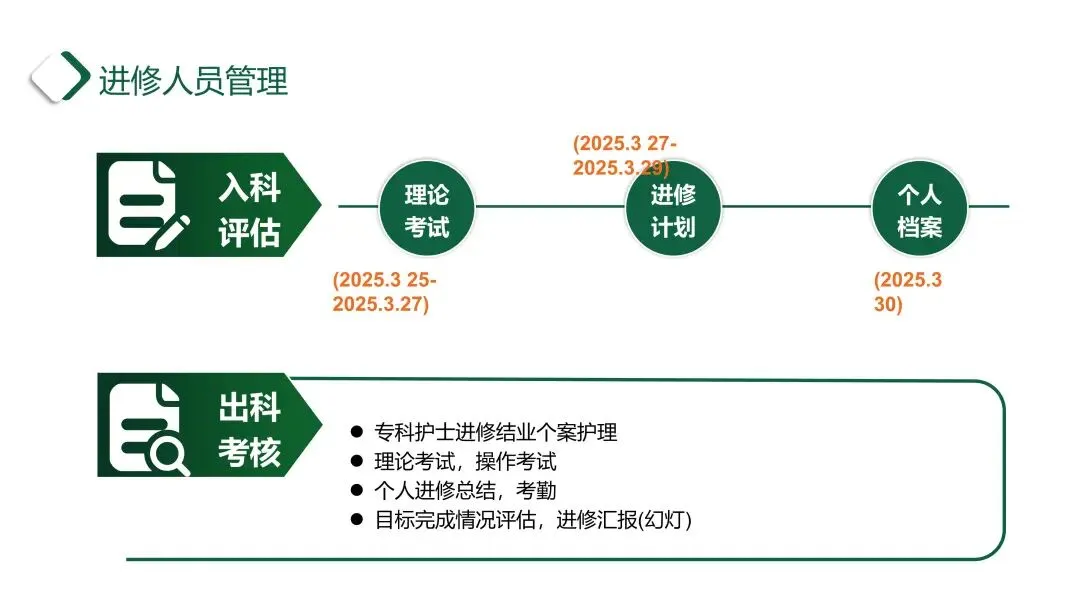 📝进修人员管理包含入科评估、2025.3.25 - 27的理论考试、2025.3.27 - 29的进修计划、2025.3.30的个人档案,以及出科考核需完成专科护士进修结业个案护理等多项内容。