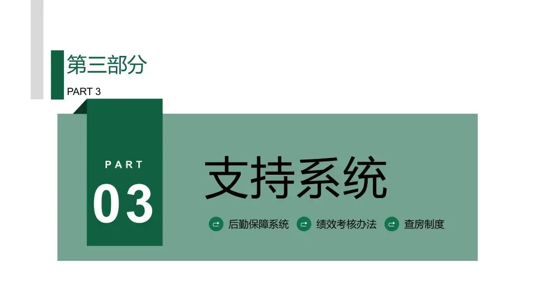 🎯第三部分(PART 3)的支持系统包含后勤保障系统、绩效考核办法、查房制度这三项内容。