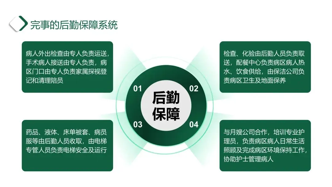 🏥完善的后勤保障系统涵盖病人运送与探视管理、检查化验及饮食卫生保障、药品等收取与电梯管理、专业护理员协作管理这四方面内容,为病区提供全面支持。