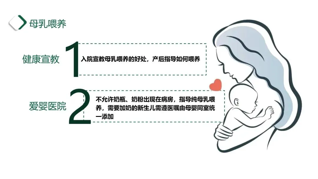 👩🍼母乳喂养的健康宣教内容为入院宣教母乳喂养好处及产后指导喂养,爱婴医院要求病房不出现奶瓶奶粉、指导纯母乳喂养,需加奶的新生儿遵医嘱由母婴同室统一添加。