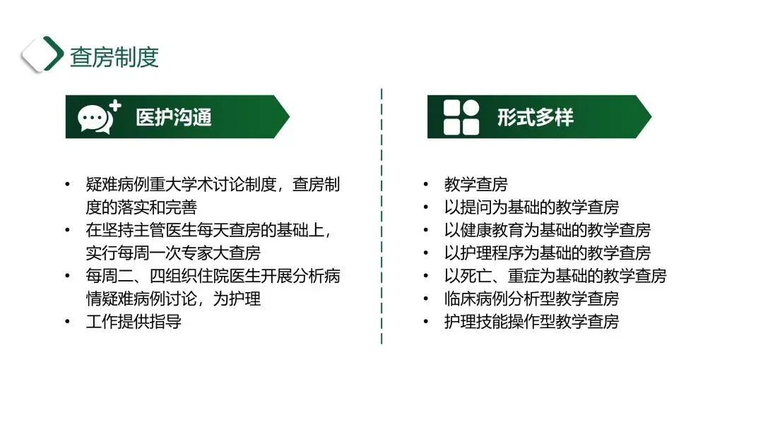 🏥查房制度包含医护沟通(落实完善相关制度、主管医生日查房+专家周查房、住院医生开展病例讨论指导护理)和形式多样(含多种教学查房类型)两方面内容。