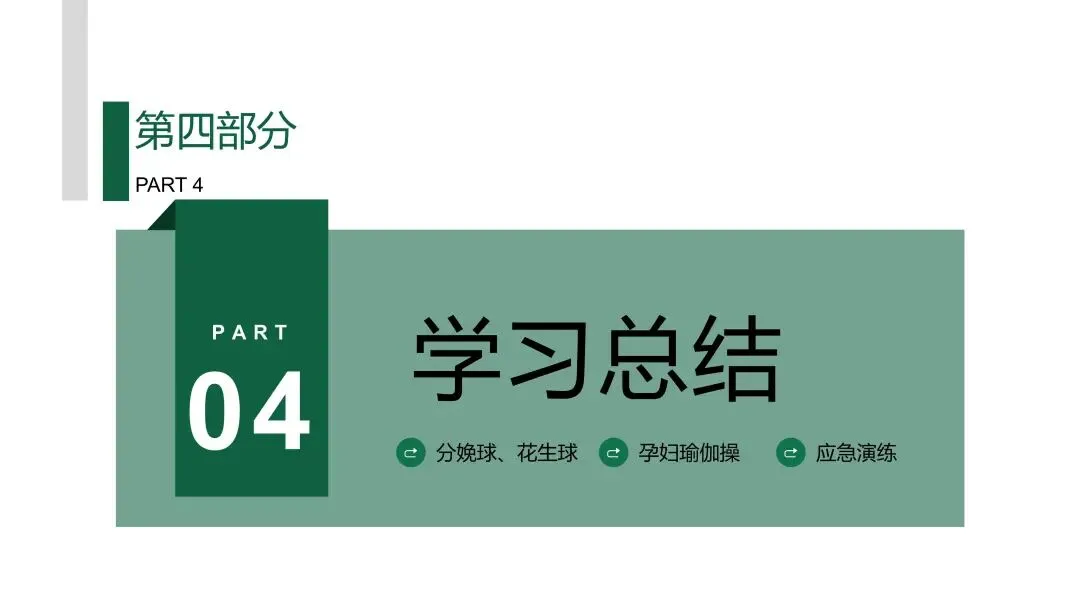 📚第四部分(PART 4)的学习总结涵盖分娩球、花生球、孕妇瑜伽操、应急演练这些内容。