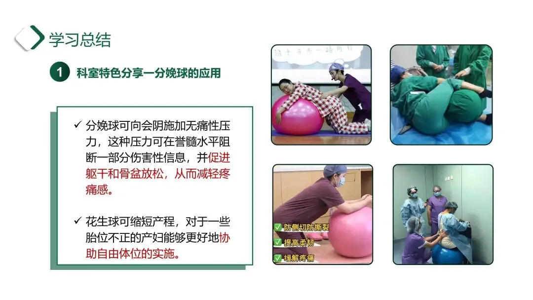 📚学习总结中科室特色分享的分娩球应用部分指出,分娩球通过向会阴施加无痛性压力减轻产妇痛感,花生球可缩短产程并协助胎位不正产妇实施自由体位。