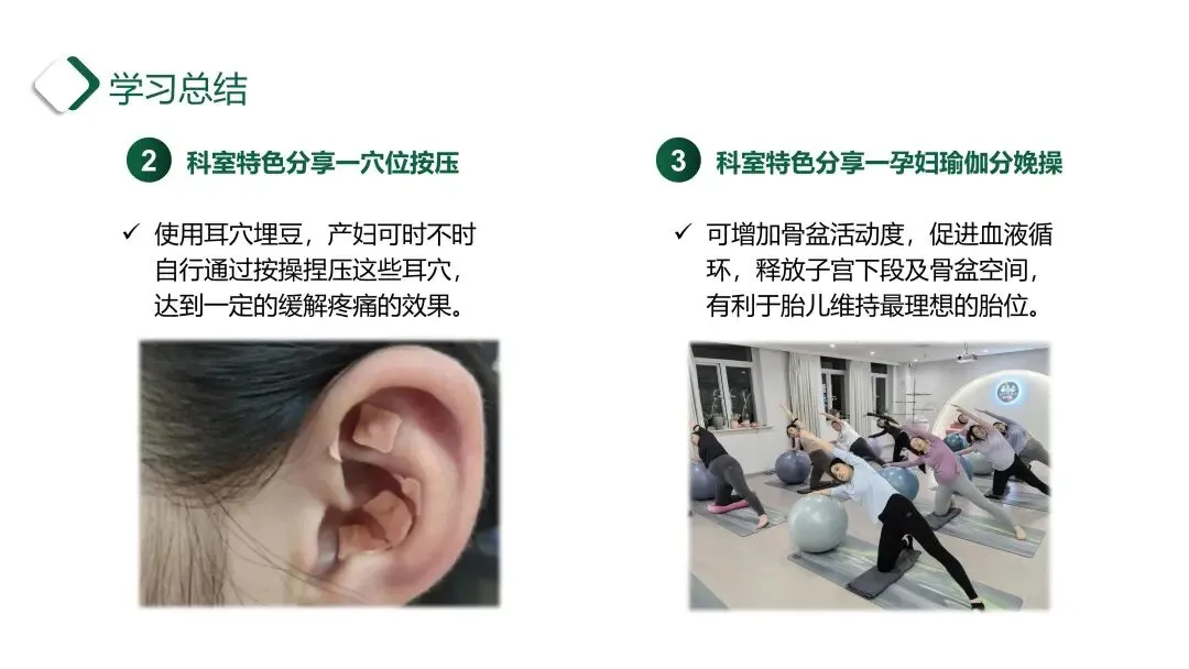 📝学习总结中,科室特色分享包括用耳穴埋豆让产妇自行按捏耳穴缓解疼痛,以及孕妇瑜伽分娩操可增加骨盆活动度、促进血液循环、释放空间并利于胎儿维持理想胎位。