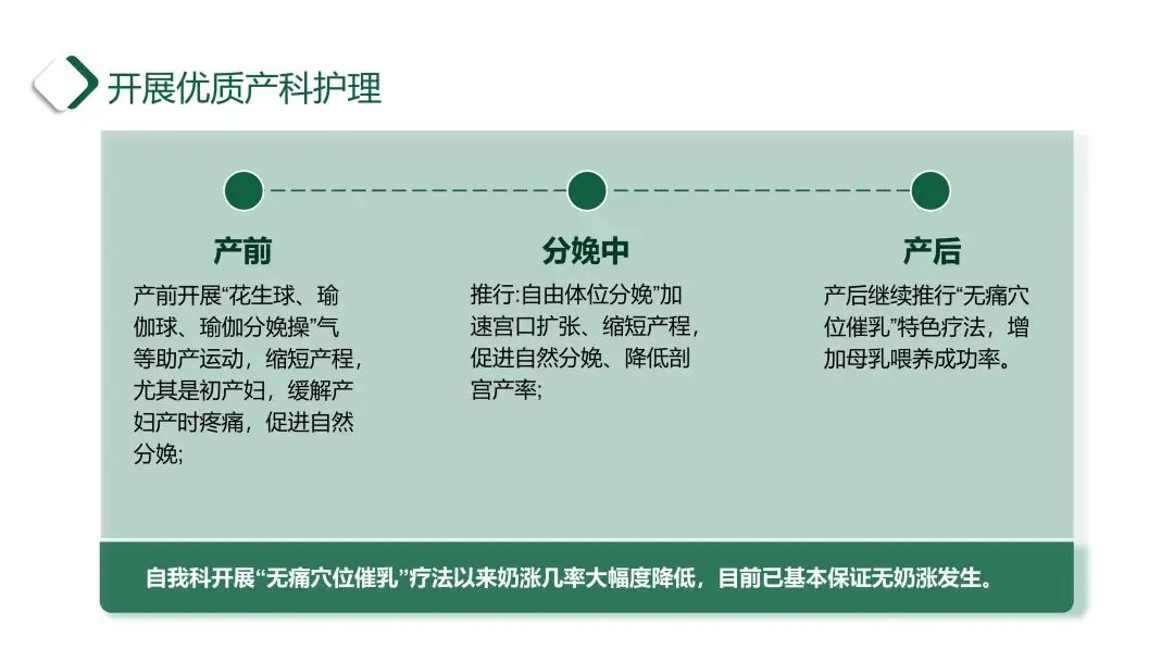 👩⚕️开展优质产科护理,产前用花生球等助产运动、分娩中推行自由体位分娩、产后推行无痛穴位催乳,且无痛穴位催乳使奶涨几率大幅降低。