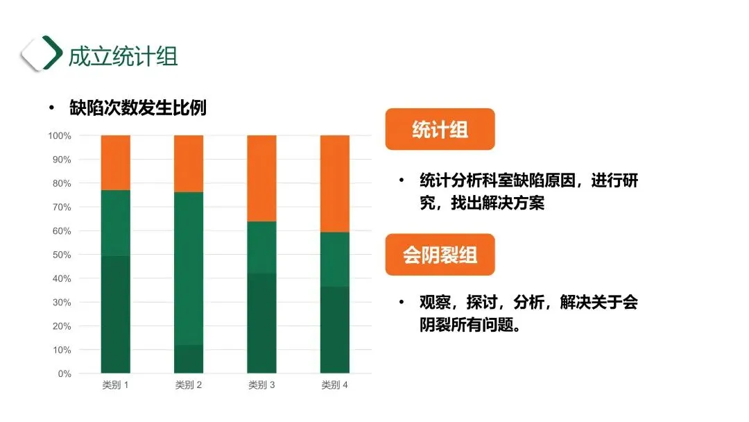 📊成立统计组,通过“缺陷次数发生比例”的柱状图展示数据,统计组负责分析科室缺陷原因并找解决方案,会阴裂组负责解决会阴裂相关问题。