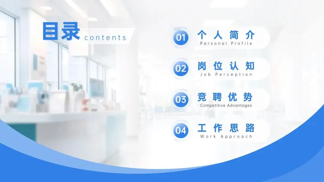 📑本PPT目录包含个人简介、岗位认知、竞聘优势、工作思路这四个部分。
