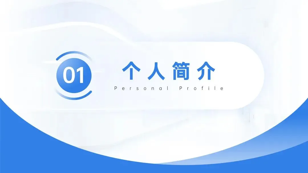 👤这张幻灯片是第一部分“个人简介(Personal Profile)”的标题页,用蓝色圆形标有“01”序号,背景为简约的蓝白风格。