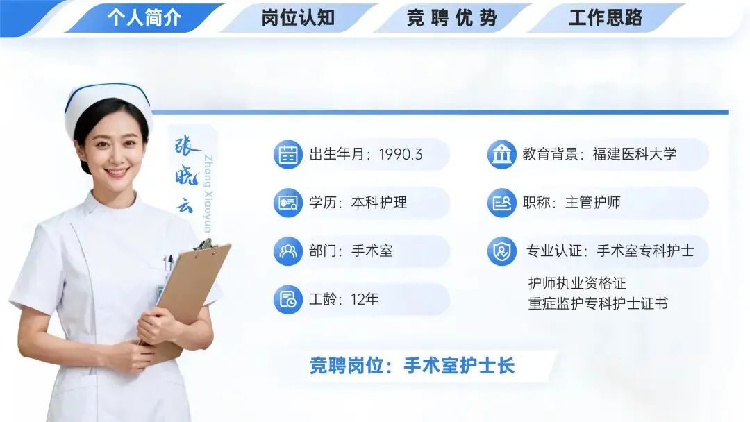 👩⚕️张晓云1990年3月出生、福建医科大学本科护理学历、手术室工作12年,职称主管护师且有手术室专科护士等认证,竞聘手术室护士长岗位。