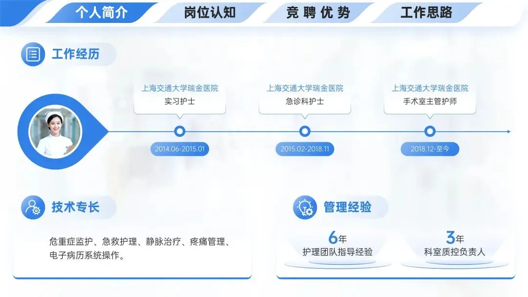 🏥个人简介板块中,工作经历显示在上海交通大学瑞金医院依次担任实习护士、急诊科护士、手术室主管护师,技术专长包含危重症监护等多项技能,管理经验有6年护理团队指导及3年科室质控负责人经验。