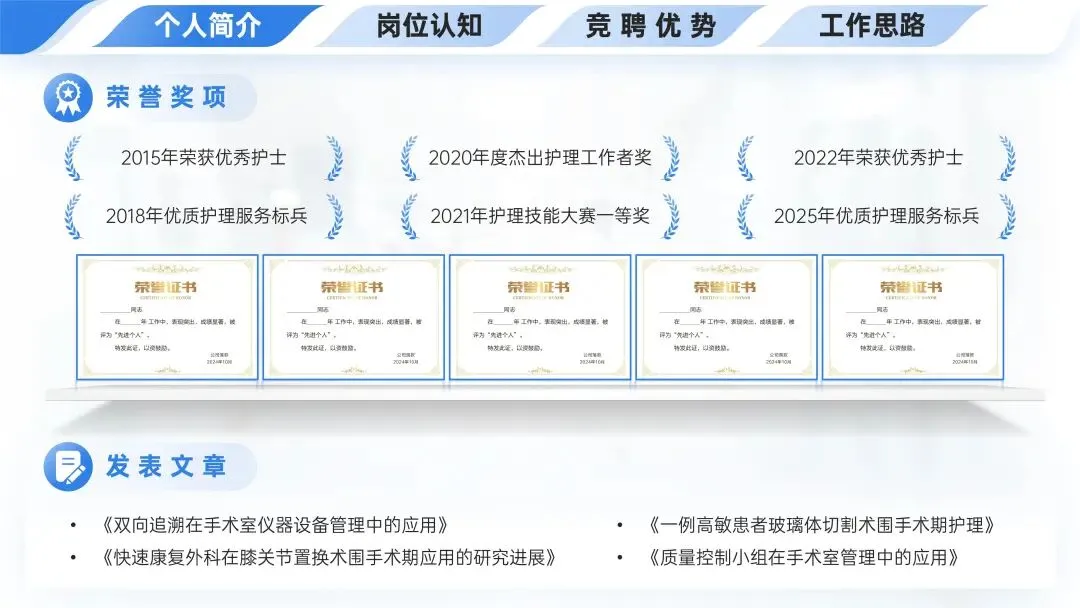 🏆个人简介里的荣誉奖项包括2015、2022年优秀护士,2018、2025年优质护理服务标兵,2020年杰出护理工作者奖、2021年护理技能大赛一等奖,还发表了《双向追溯在手术室仪器设备管理中的应用》等四篇文章。