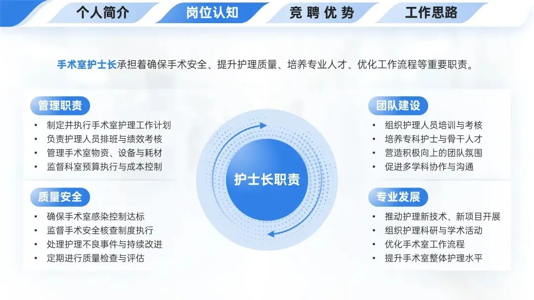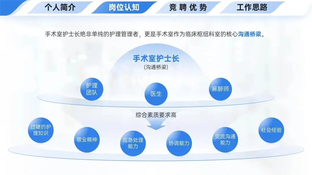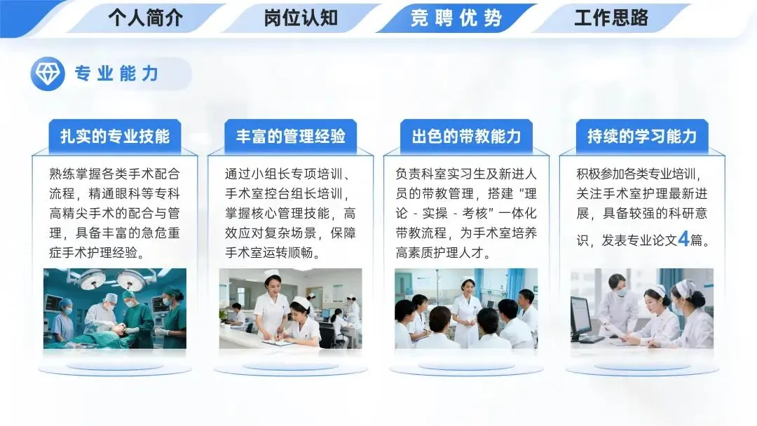 💎竞聘优势中的专业能力包含扎实的手术配合等专业技能、丰富的管理经验、出色的带教能力及持续的学习能力这四个方面,分别从手术配合管理、管理技能掌握、带教流程搭建和专业培训科研等角度进行了阐述。