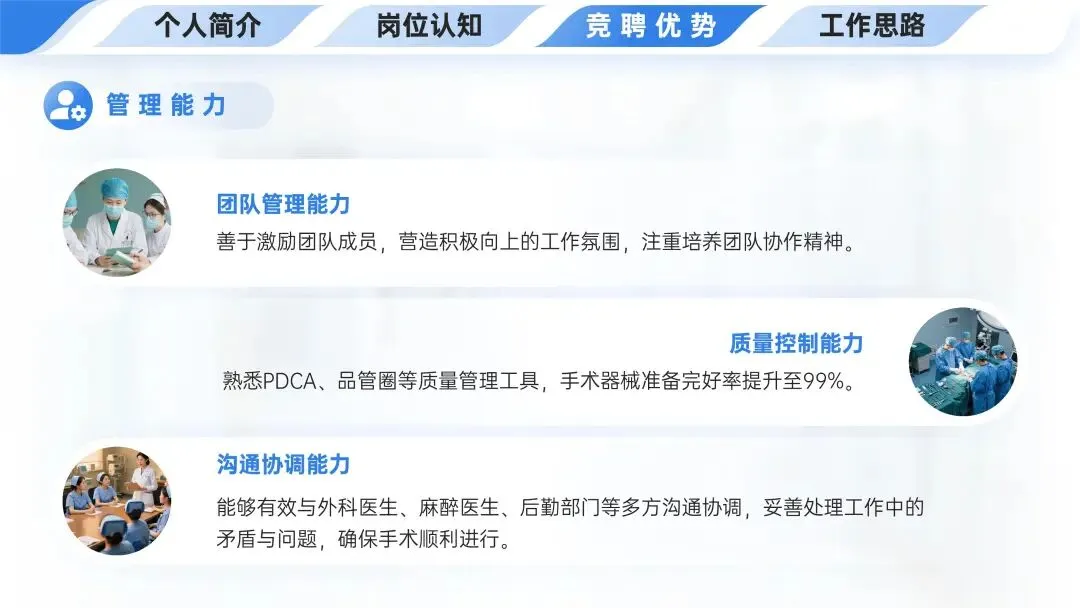 💼竞聘优势之管理能力包含三方面:团队管理能力上善于激励成员、营造氛围、培养协作精神;质量控制能力上熟悉PDCA等工具,使手术器械准备完好率达99%;沟通协调能力上能与多方沟通,妥善处理问题确保手术顺利。