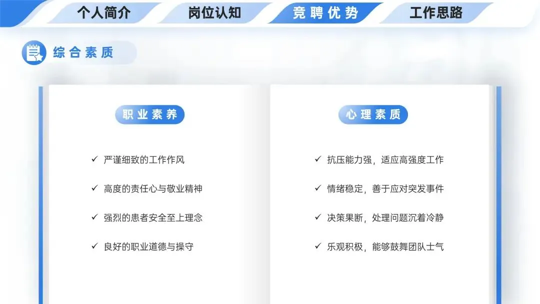 💼竞聘优势中综合素质涵盖职业素养(严谨细致等4点)和心理素质(抗压能力强等4点)两方面内容。