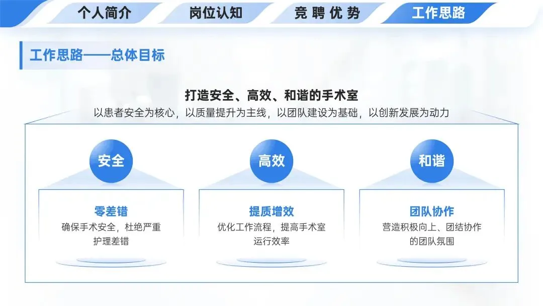 🏥工作思路的总体目标是打造安全、高效、和谐的手术室,以患者安全为核心、质量提升为主线、团队建设为基础、创新发展为动力,其中安全要实现零差错、高效要提质增效、和谐要团队协作。