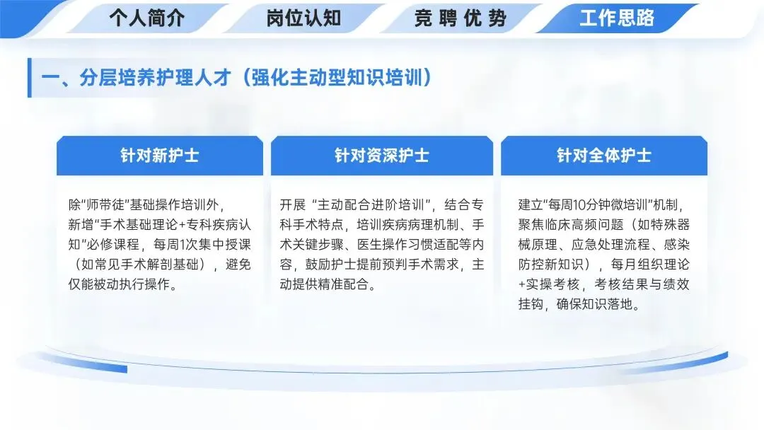💡工作思路中分层培养护理人才(强化主动型知识培训),针对新护士新增理论认知课程、资深护士开展进阶培训、全体护士建立微培训机制并考核,以提升护理能力。