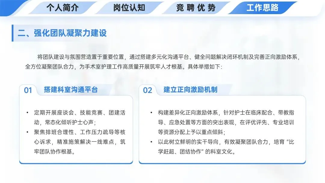 👥工作思路中强化团队凝聚力建设,通过搭建科室沟通平台(开展座谈会等活动、解决核心诉求)和建立正向激励机制(差异化激励、倾斜资源),全方位凝聚团队合力,为手术室护理工作筑牢人才根基。