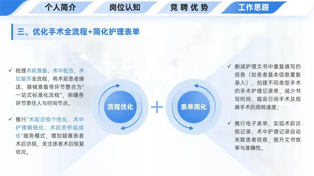 🏥工作思路之优化手术全流程+简化护理表单,通过梳理手术全流程、推行个性化服务模式实现流程优化,通过删减重复信息、推行电子表单实现表单简化。