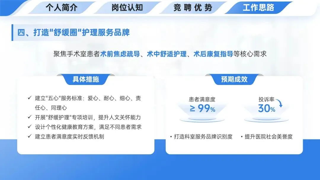🏥工作思路中打造“舒缓圈”护理服务品牌,聚焦手术室患者术前焦虑疏导、术中舒适护理、术后康复指导等核心需求,通过建立“五心”服务标准等具体措施,预期患者满意度≥99%、投诉率降30%,并打造科室服务品牌识别度、提升医院社会美誉度。