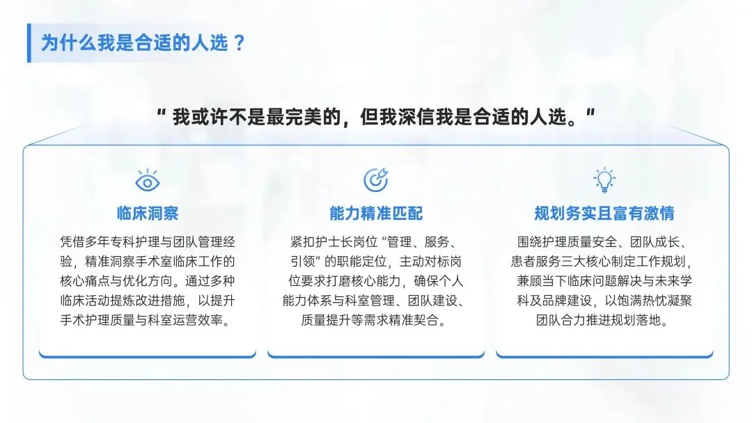 💪从临床洞察、能力精准匹配、规划务实且富有激情三个维度,阐述“我或许不是最完美的,但我深信我是合适的人选”的理由,以证明自己适合护士长岗位。