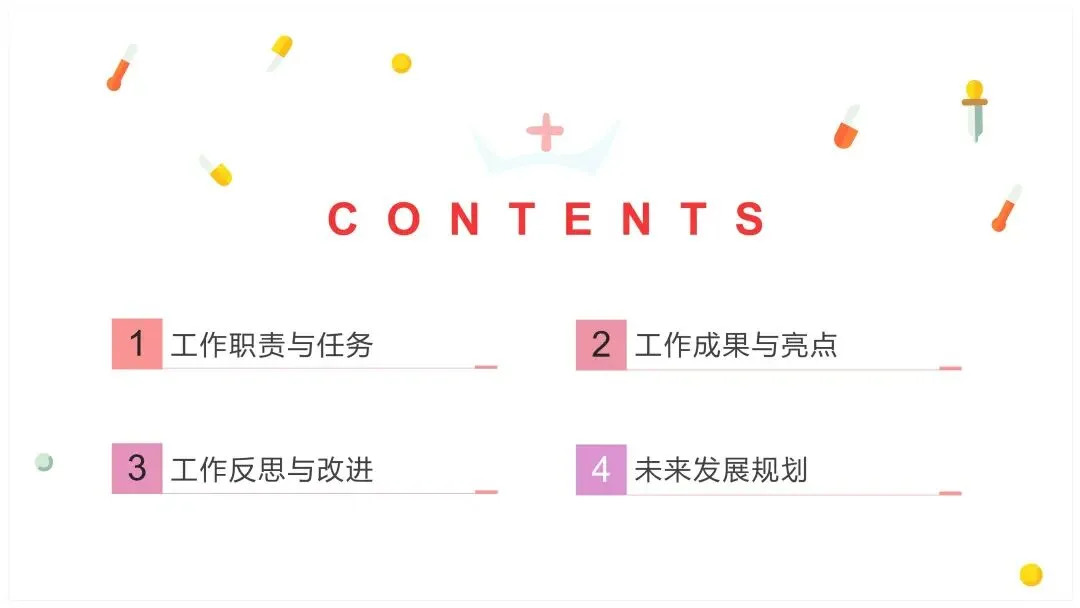 💊本PPT内容包含工作职责与任务、工作成果与亮点、工作反思与改进、未来发展规划这四个部分。