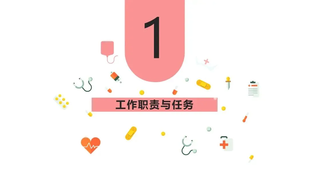 🏥这张幻灯片以医疗元素为背景,用醒目的数字“1”和粉色条带标注出第一部分内容为“工作职责与任务”。