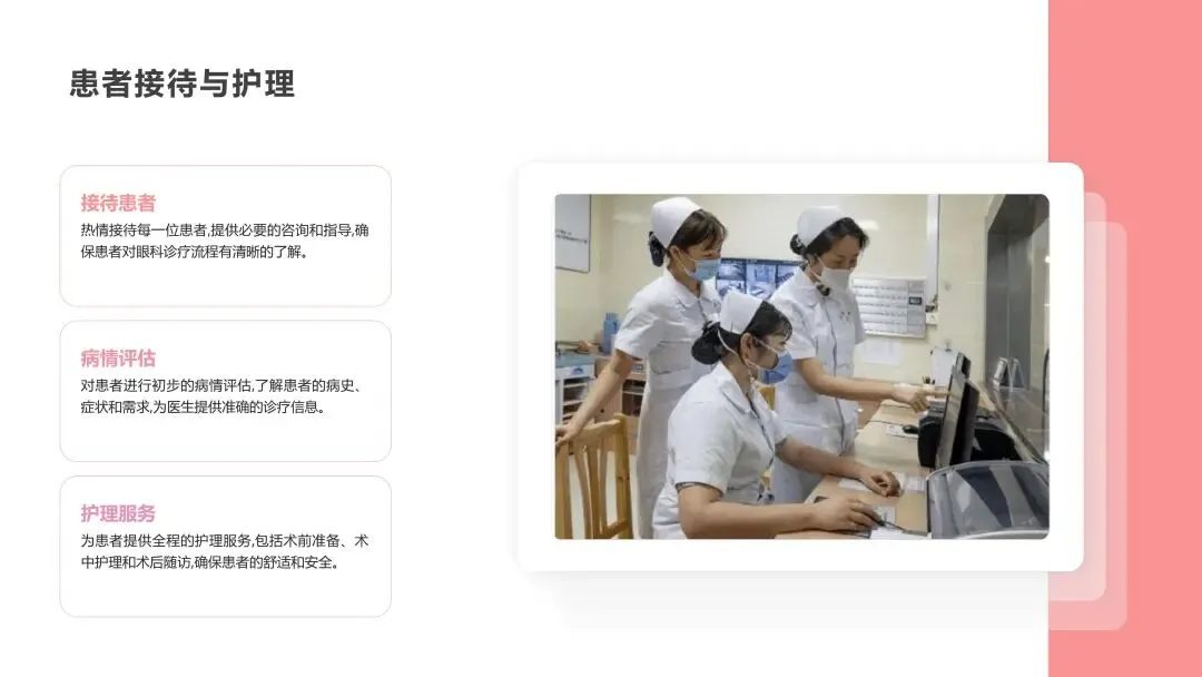 👩⚕️今天我作为XX市人民医院的眼科护理护士XXX,将围绕“只要献出一点爱生命因你而精彩”的理念,汇报我的眼科护理工作情况。