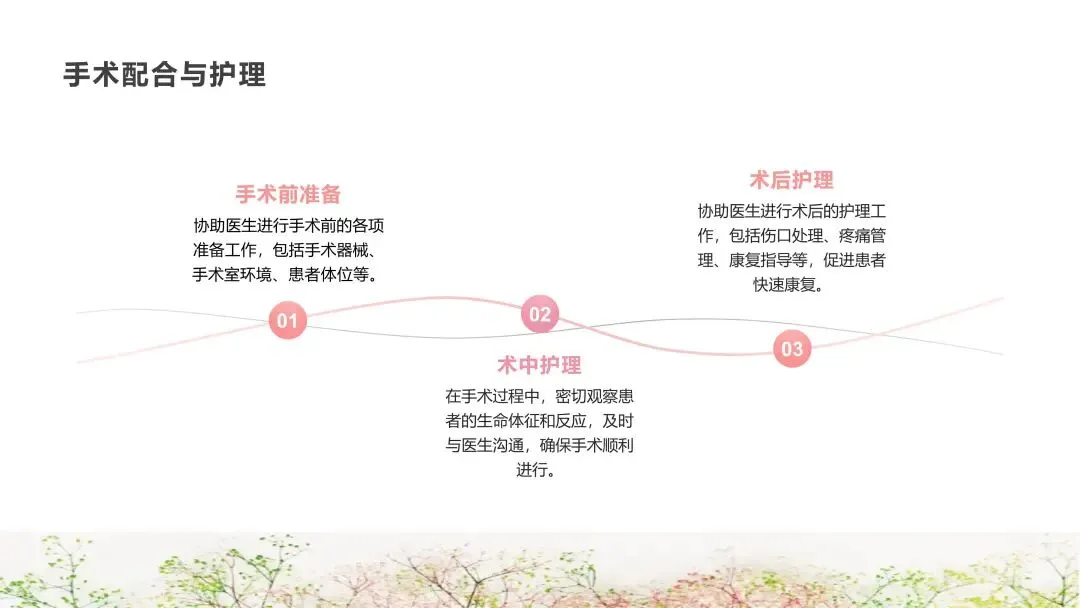 🏥手术配合与护理分为术前准备(协助医生做器械、环境、体位等准备)、术中护理(观察生命体征并沟通确保手术顺利)、术后护理(协助医生做伤口、疼痛、康复指导等护理促患者康复)三部分。