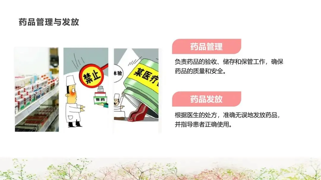 💊药品管理与发放工作中,药品管理负责验收、储存和保管以确保质量安全,药品发放则根据处方准确发药并指导患者正确使用。