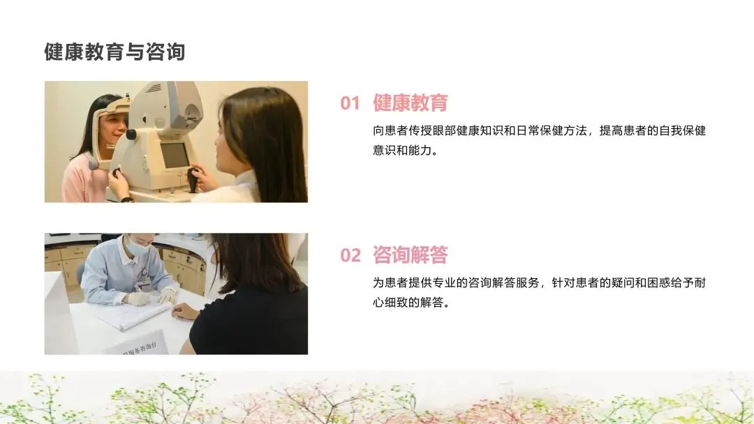 👀健康教育与咨询包含两部分,一是向患者传授眼部健康知识和日常保健方法以提高其自我保健意识和能力,二是为患者提供专业咨询解答服务以耐心细致解答疑问和困惑。