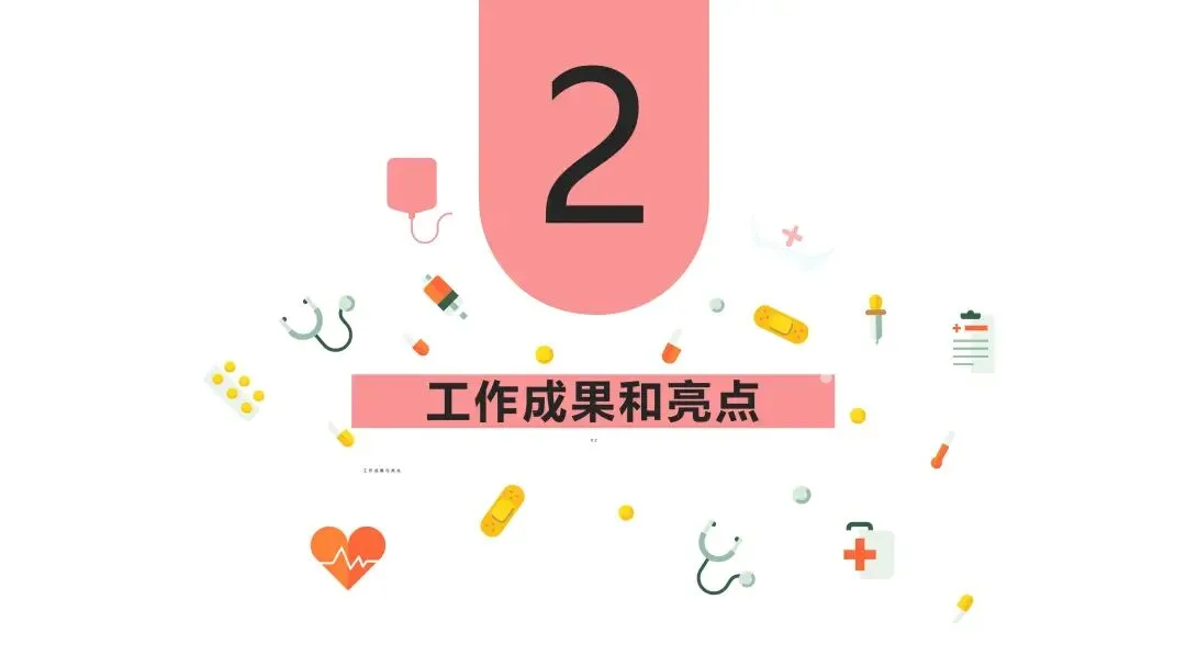 🏥这是第二部分内容“工作成果和亮点”,背景配有听诊器、药瓶、绷带等医疗相关图标,用于介绍医疗相关工作的成果与亮点。