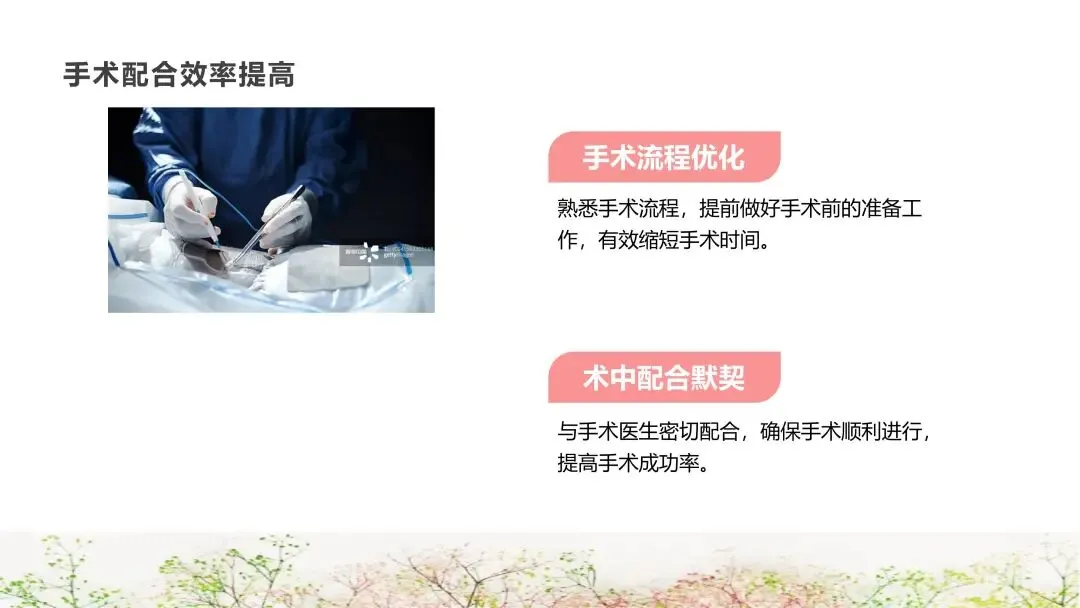 🏥手术配合效率提高,一方面通过手术流程优化,熟悉流程、提前准备以缩短手术时间,另一方面通过术中配合默契,与医生密切配合确保手术顺利、提高成功率。