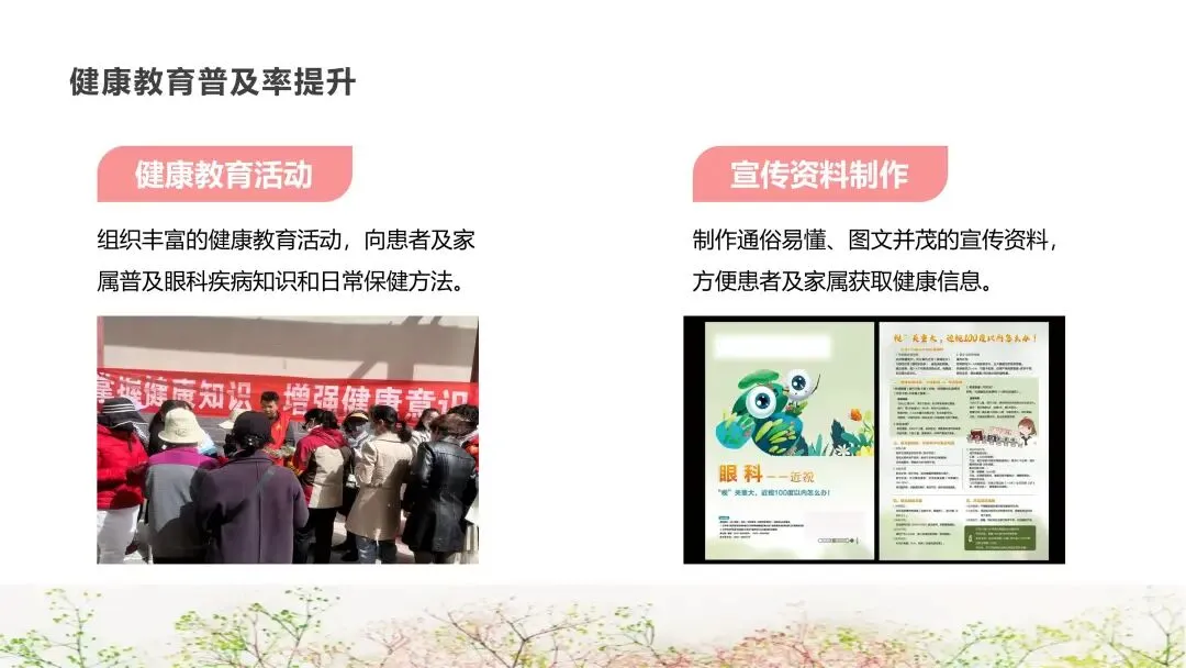 👁️🗨️通过组织丰富的健康教育活动向患者及家属普及眼科疾病知识和日常保健方法,以及制作通俗易懂、图文并茂的宣传资料方便其获取健康信息,来提升健康教育普及率。