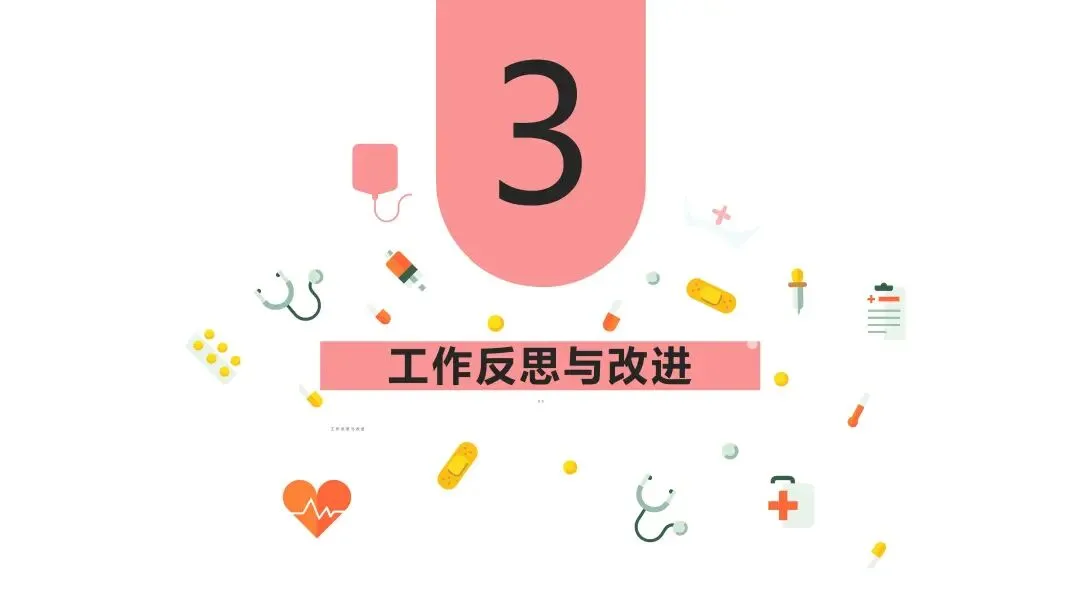 💊这是第3部分“工作反思与改进”的幻灯片,以医疗相关图标为装饰,用于阐述医疗工作的反思与改进内容。