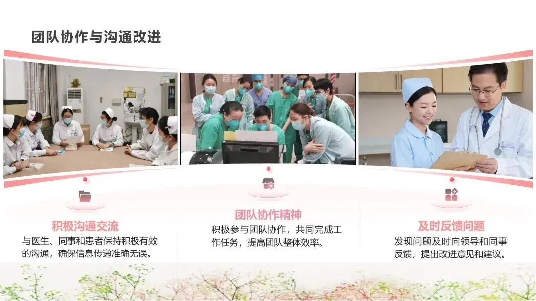 🏥本页聚焦“团队协作与沟通改进”,通过医护团队交流、协作、反馈的场景,阐述通过积极沟通交流、弘扬团队协作精神、及时反馈问题这三方面来提升团队协作与沟通水平。