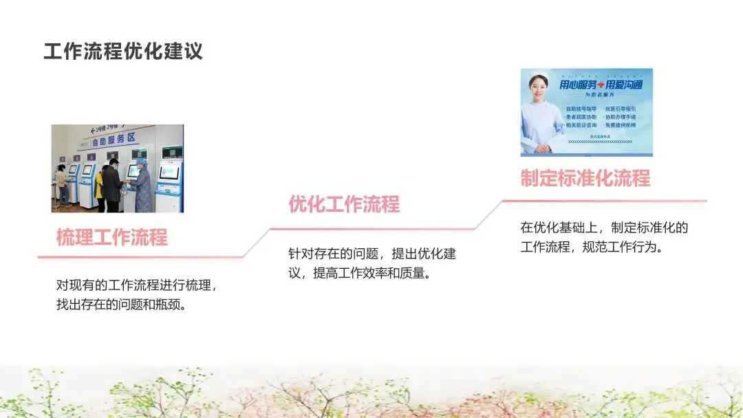 💼工作流程优化建议分为梳理工作流程(梳理现有流程找问题瓶颈)、优化工作流程(针对问题提建议提效率质量)、制定标准化流程(优化基础上定标准流程规范行为)三个步骤。