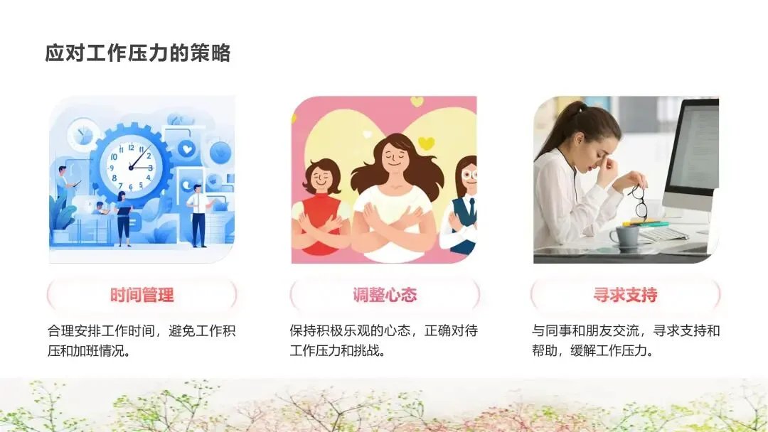 💼应对工作压力的策略包括通过时间管理合理安排工作时间避免积压加班、调整心态以积极乐观对待压力挑战、寻求支持即与同事朋友交流获取帮助来缓解压力。
