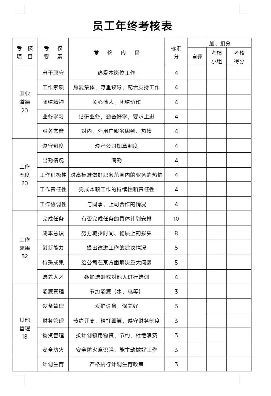 可编辑|员工年终考核表word文档