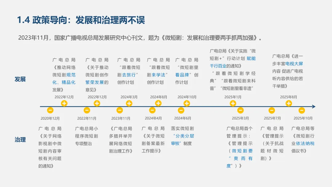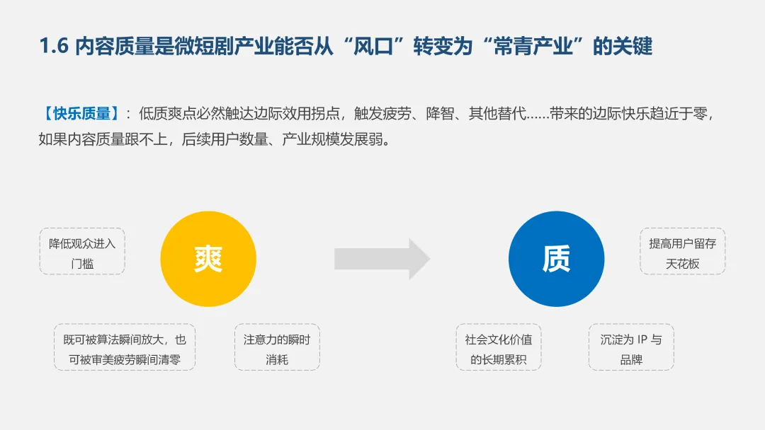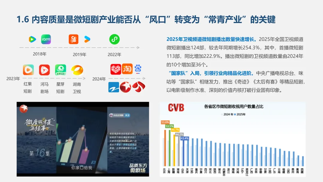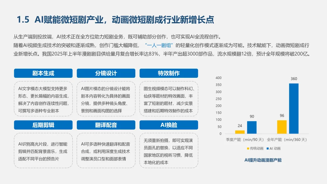 技术面,人工智能正全链条赋能微短剧,从剧本生成、分镜设计到多语种配音等,推动“一人一剧组”成为可能,动画微短剧更是成为新增长点。政策面,坚持“发展与治理并重”,通过一系列精品化创作计划和规范化管理举措,引导行业从“野蛮生长”迈向“内容提质”。未来,产业能否从“风口”变为“常青树”,关键在于突破“爽点疲劳”,注重快乐质量,以实现可持续发展和社会文化价值的长期积累。