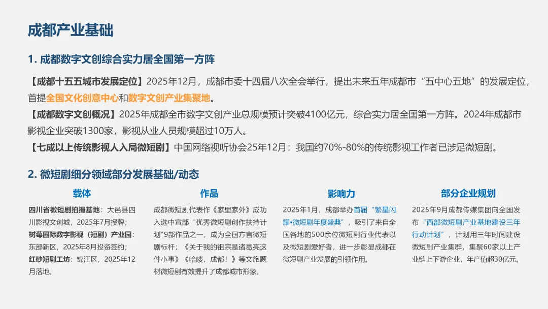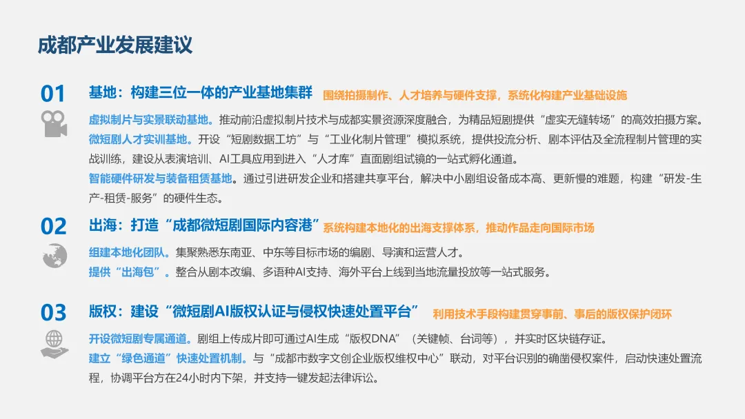 成都数字文创综合实力居全国第一方阵,未来五年成都市“五中心五地”的发展定位首提全国文化创意中心和数字文创产业集聚地。建议系统性构建“拍摄制作-人才实训-硬件支撑”三位一体的产业基地,打造“成都微短剧国际内容港”推动出海,建设“微短剧AI版权认证与侵权快速处置平台”,从而在精品化与国际化浪潮中占据产业制高点。