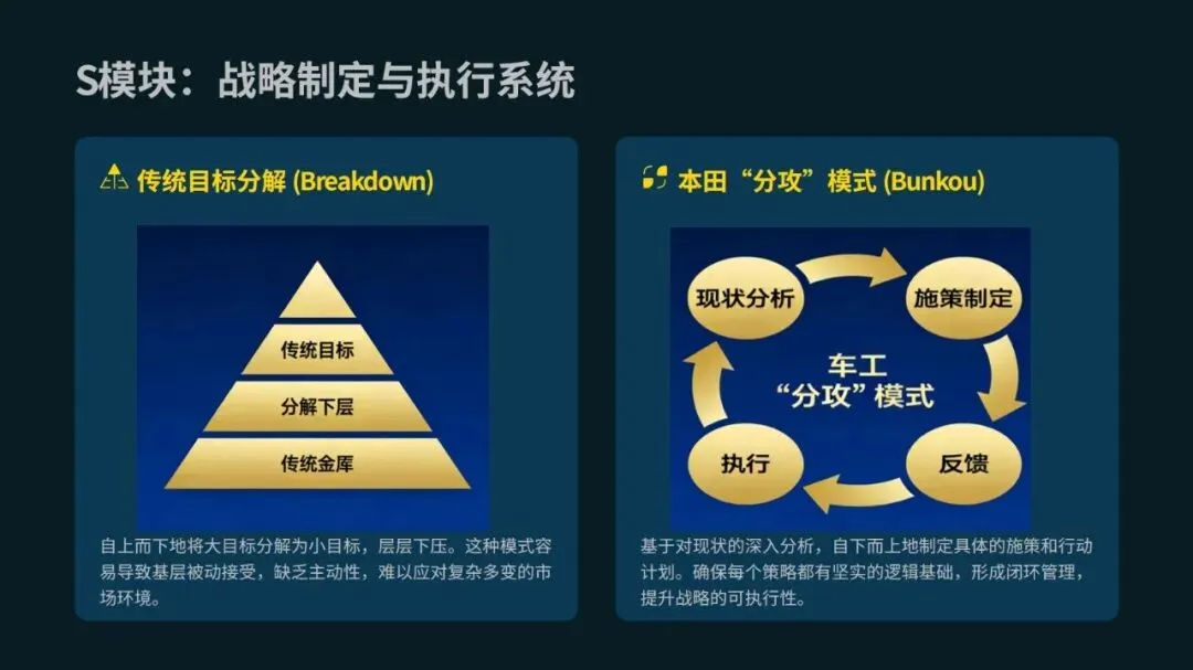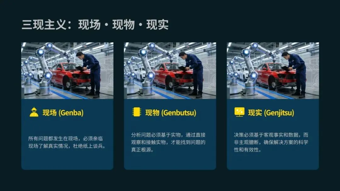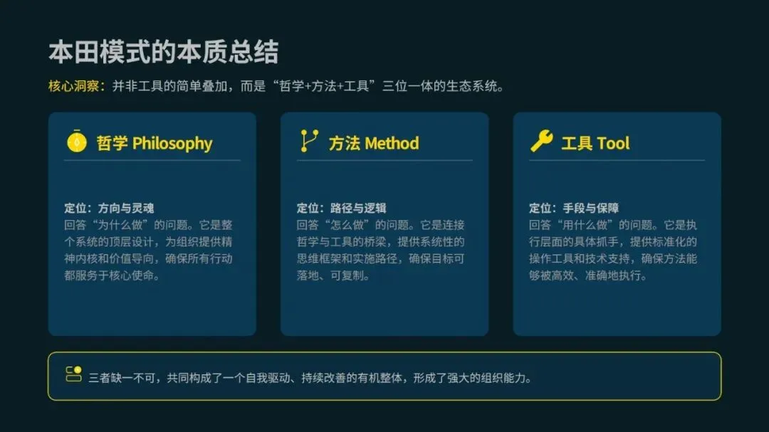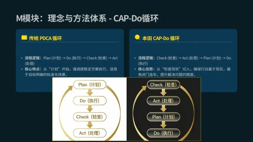 本田管理模式的核心思路是 “自立” 与 “尊重人”,搭建起涵盖理念、战略、商品、品质、技术的 MS-PQD 完整体系,完美实现了从 “单纯制造” 到 “主动创造” 的跨越。它最亮眼的地方,是把抽象的管理哲学和具体的实操工具紧密结合 —— 靠三现主义(现场、现物、现实)避免纸上谈兵,用数据和逻辑筑牢管理闭环,再通过 CAP-Do、DST-PDCA 这些方法,让业务能持续优化迭代。