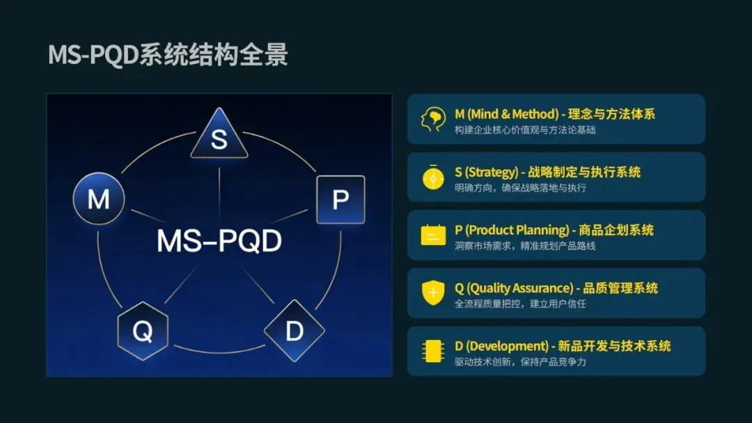 MS-PQD 的五个模块各有侧重又相互配合:M 模块打下理念和方法的基础,解决了传统管理里凭感觉做事的问题;S 模块用 “分攻” 的思路推进战略落地,不让目标和执行脱节;P 模块通过 “天地人彼我” 的全方位分析,精准抓住市场需求;Q 模块靠三域五区体系和五原则表,从根上解决品质问题;D 模块用 “四位一体” 的开发模式,既提高了新品成功率,又沉淀了核心技术。