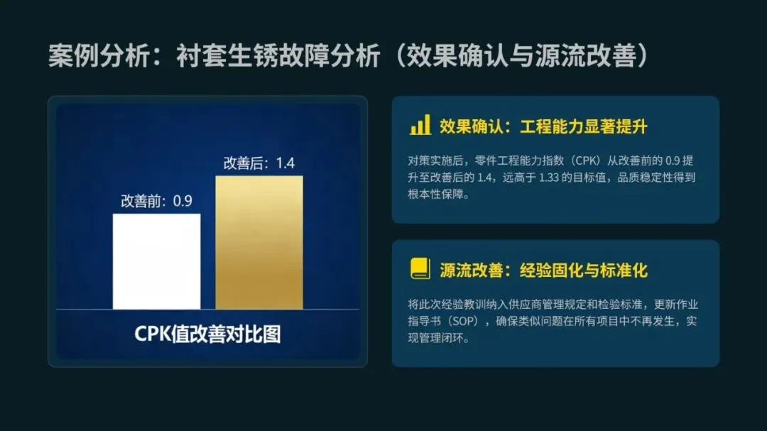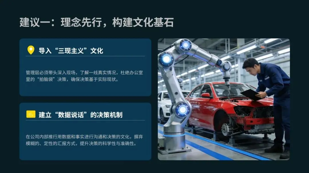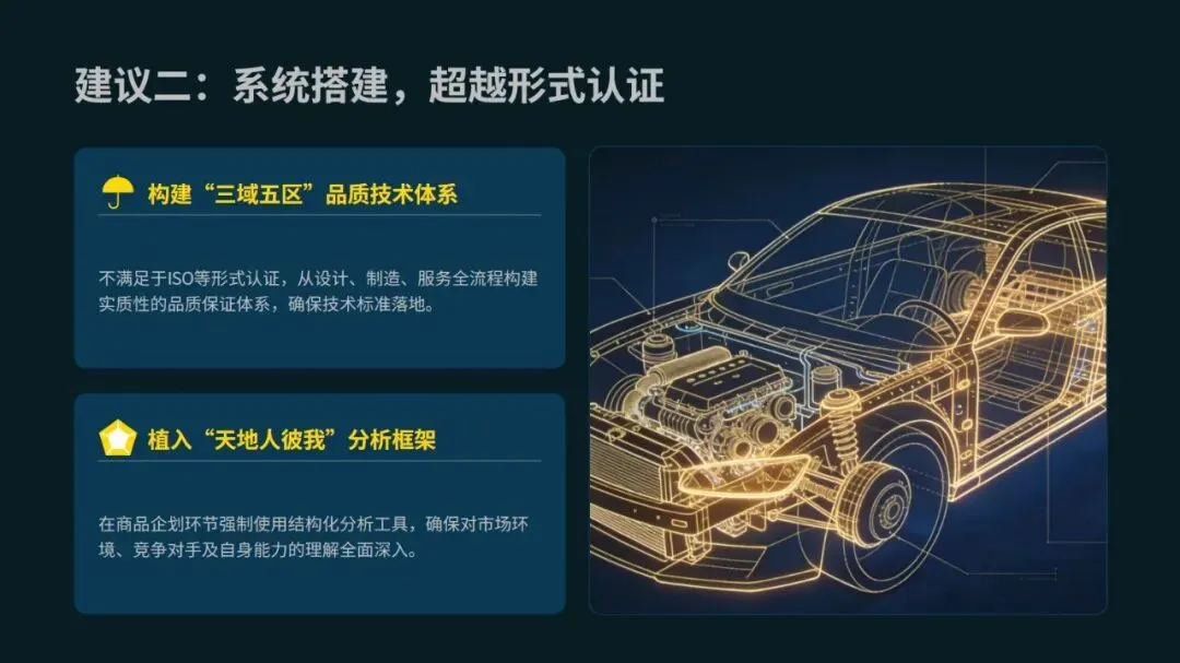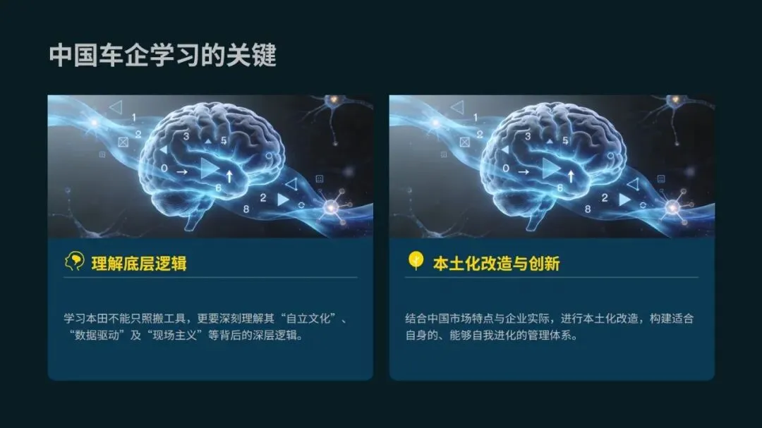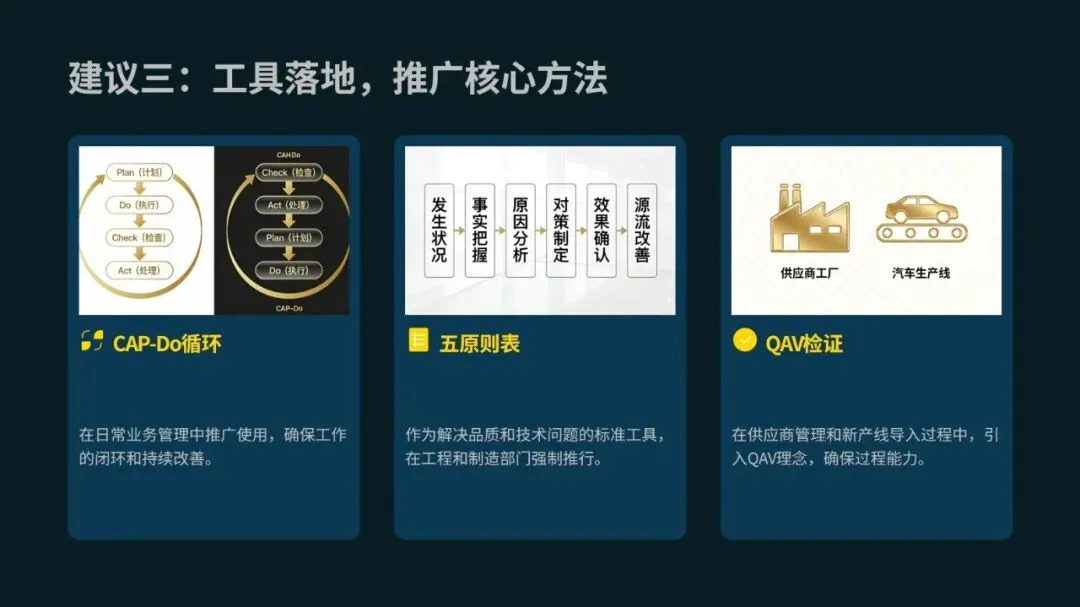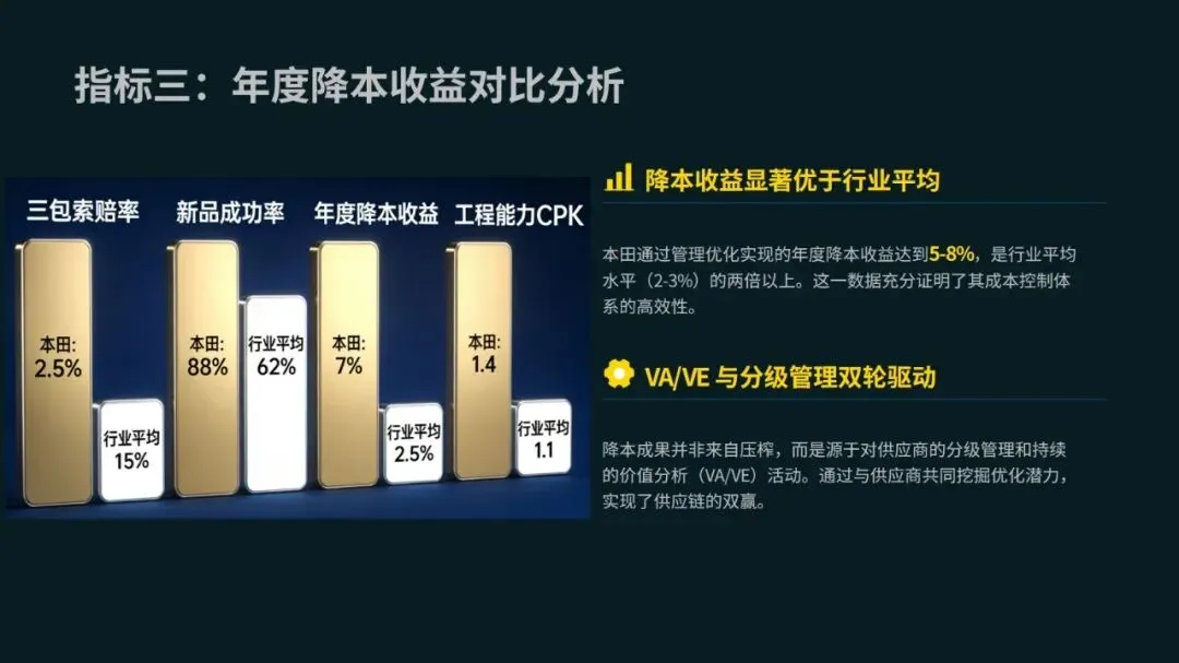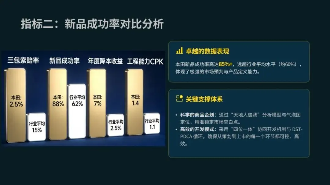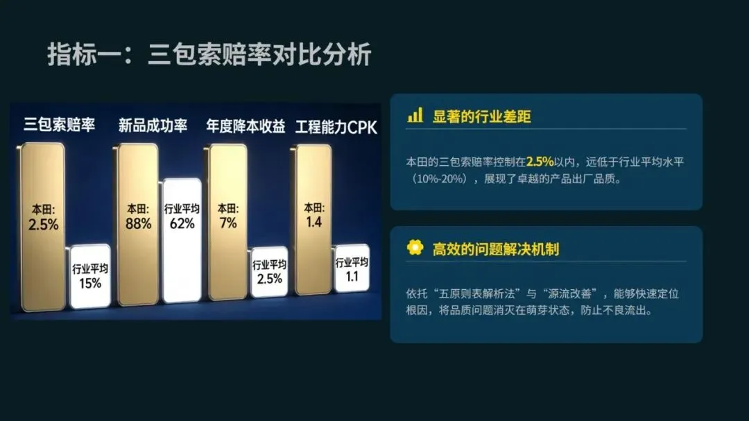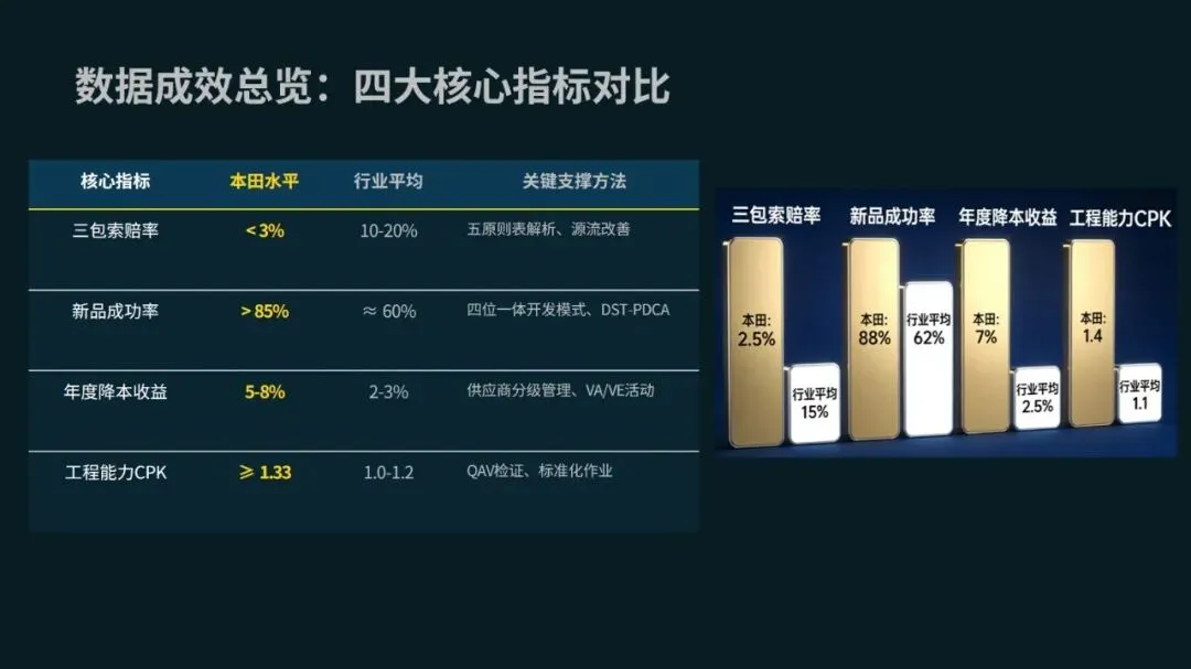 这套模式的实际效果很突出,在三包索赔率、新品成功率、降本收益这些关键指标上,都比行业平均水平表现好得多。对中国车企来说,真正该学的是:先把这些管理理念植入团队,再搭建系统化的管理框架,落地数据化、重现场、讲逻辑的工作方法,同时抓好人才培养和技术积累,最终实现从跟着别人走到主动引领市场的转变。
