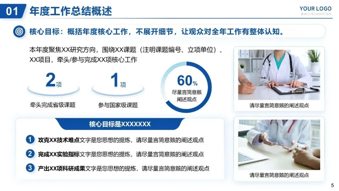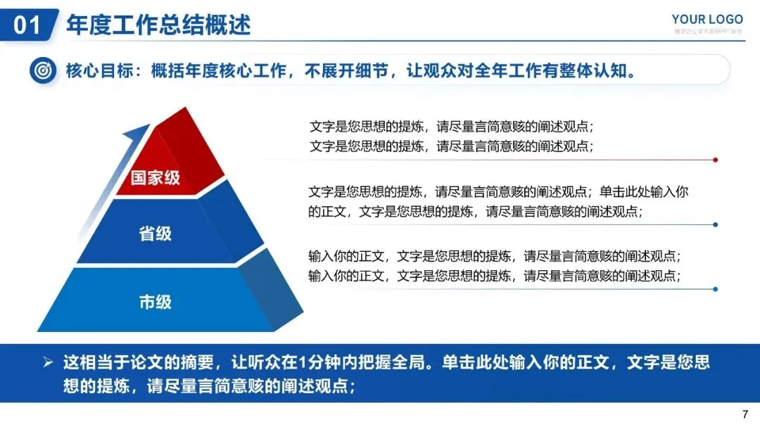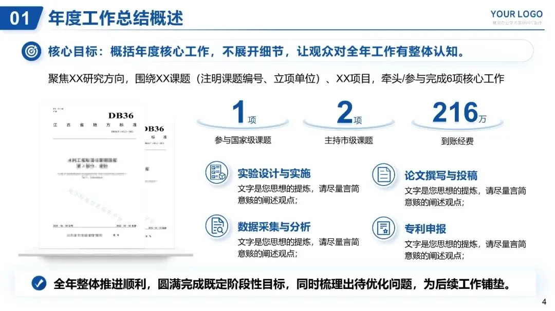 核心目标:概括年度核心工作,不展开细节,让观众对全年工作有整体认知。
