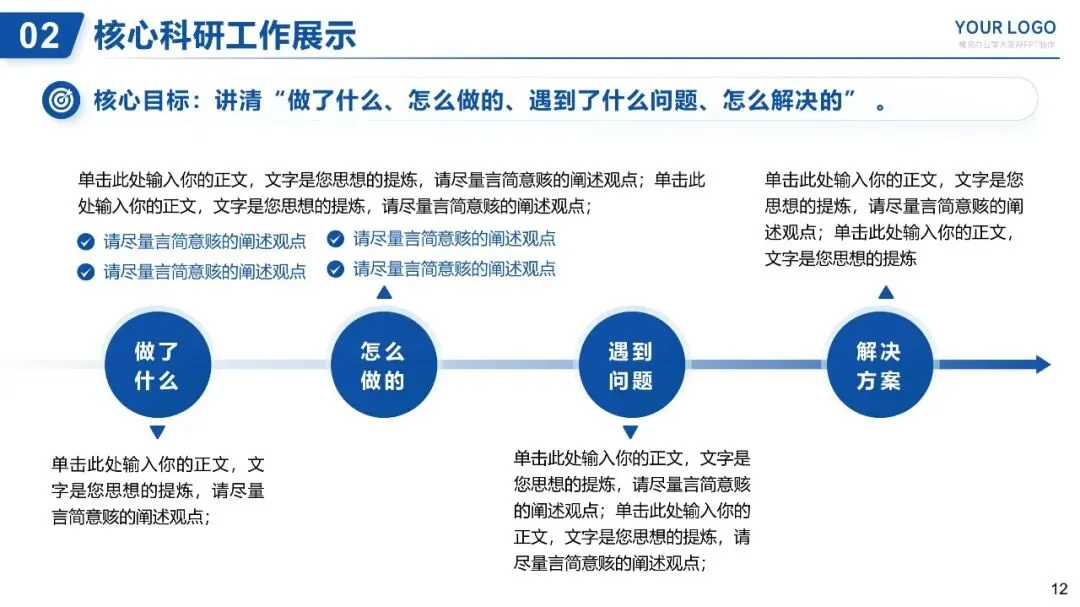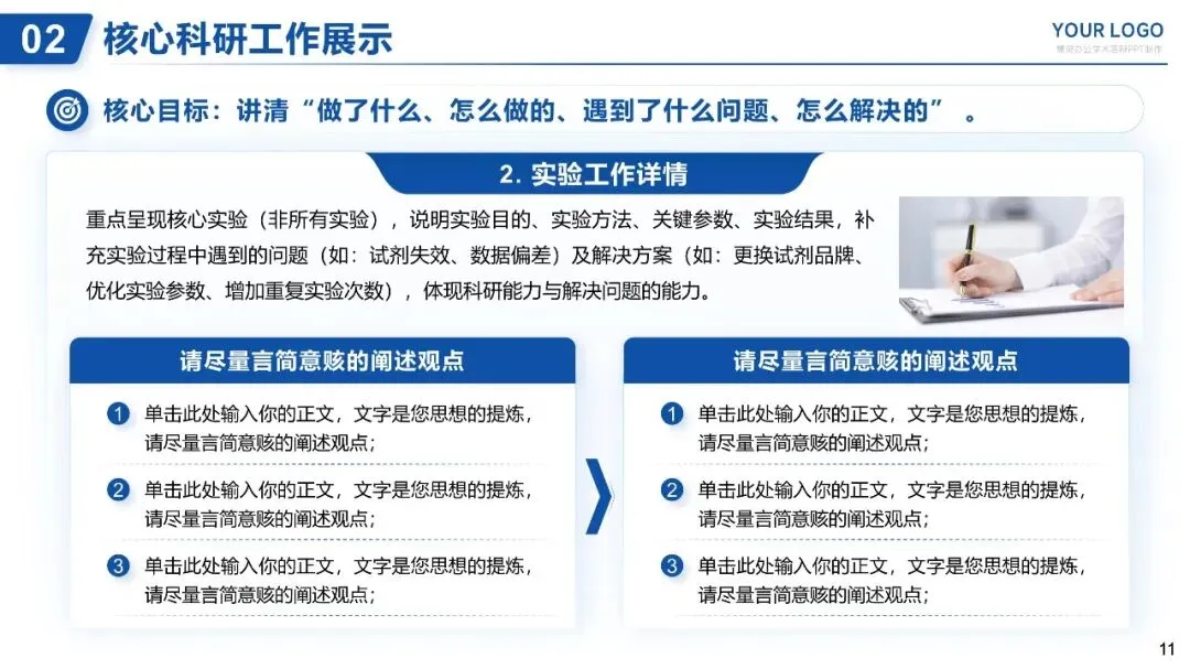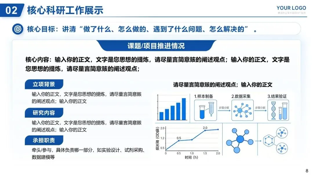 核心目标:讲清“做了什么、怎么做的、遇到了什么问题、怎么解决的”,体现科研严谨性。