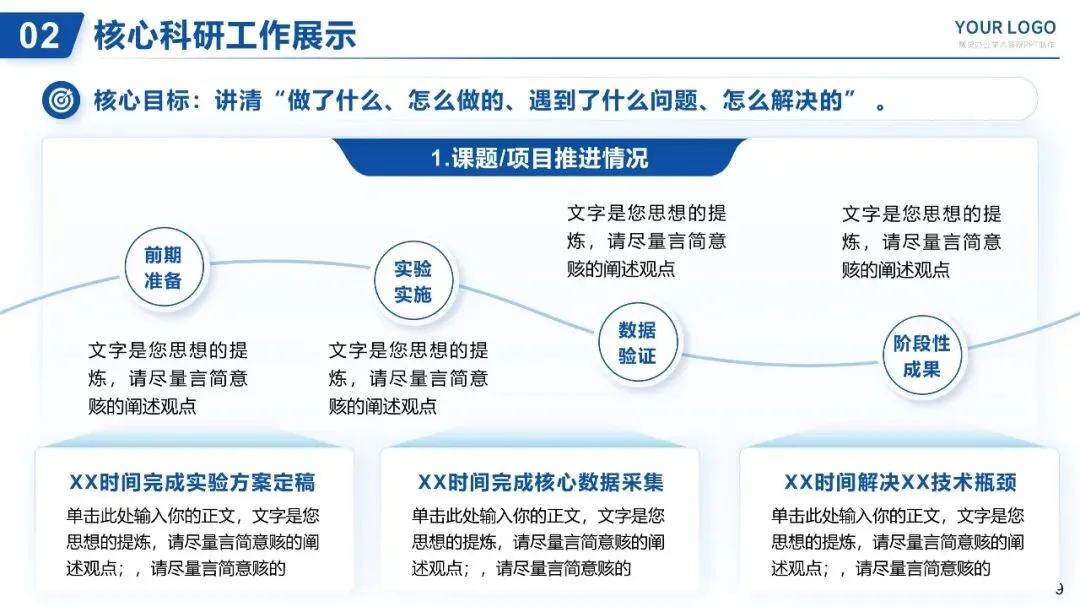 - 推进过程:分阶段呈现(如:前期准备、实验实施、数据验证、阶段性成果),重点说明关键节点(如:XX时间完成实验方案定稿、XX时间完成核心数据采集、XX时间解决XX技术瓶颈);