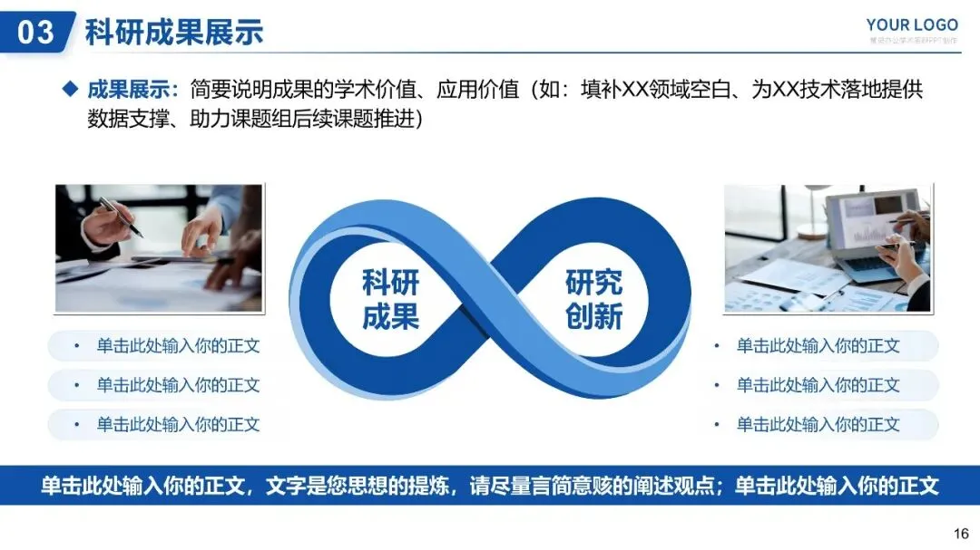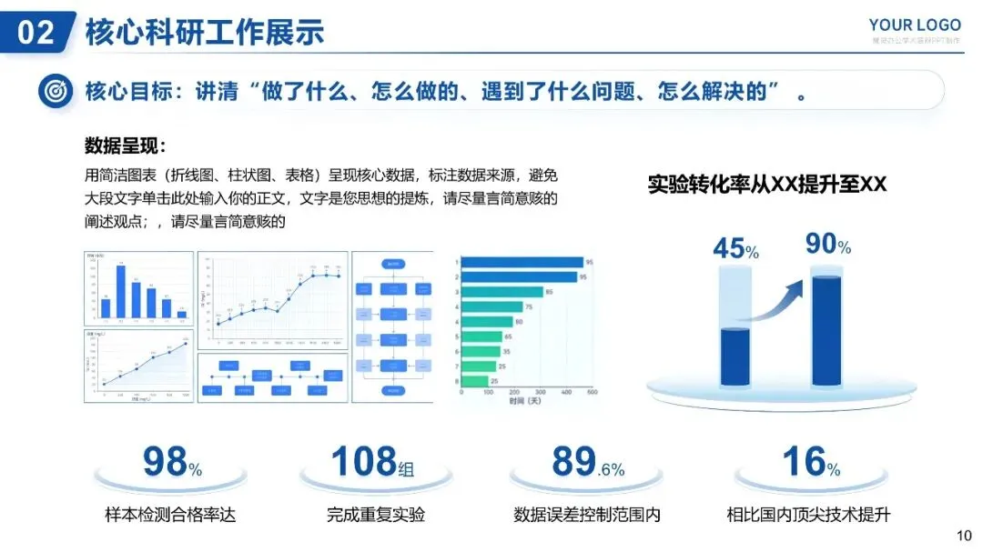 - 数据呈现:用简洁图表(折线图、柱状图、表格)呈现核心数据,标注数据来源,避免大段文字(如:实验转化率从XX提升至XX、样本检测合格率达XX%、完成XX组重复实验,数据误差控制在XX范围内)。