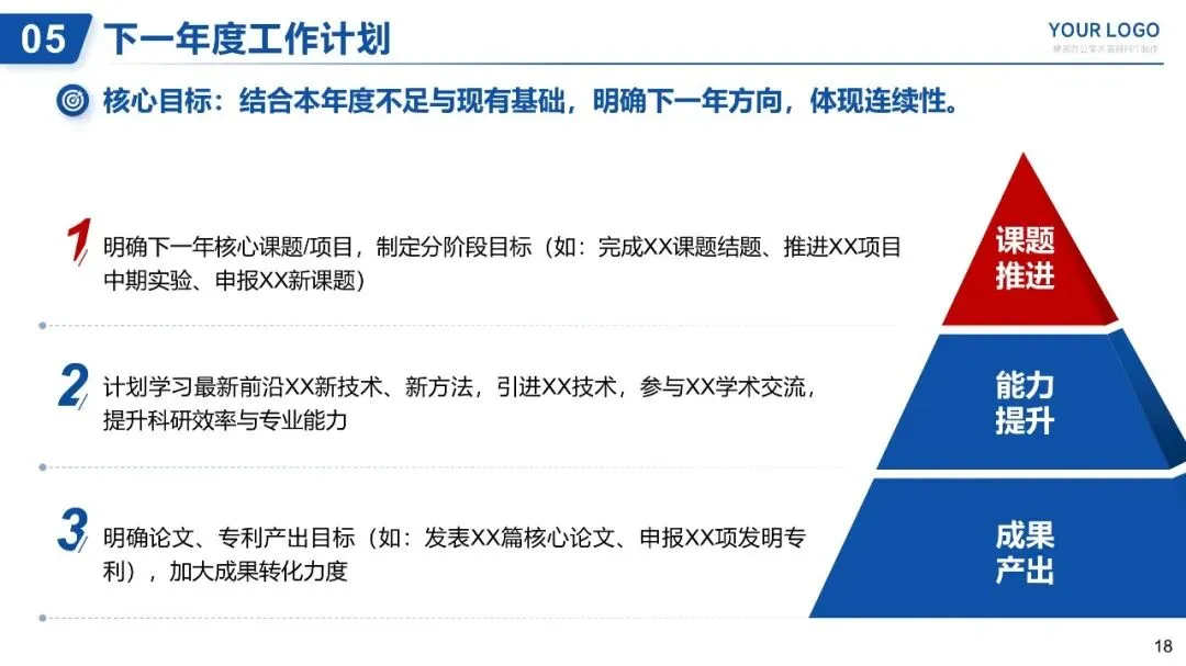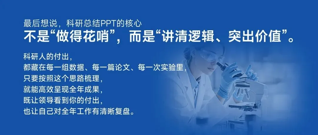 年底将至,科研人们除了赶实验、整数据,最头疼的莫过于年终工作总结PPT。不同于行政岗的流程化总结,科研总结的核心是“讲清逻辑、突出成果、体现价值”——既要让非专业的领导看懂你的付出,也要让同行认可你的科研能力,更要为下一年的工作争取支持。