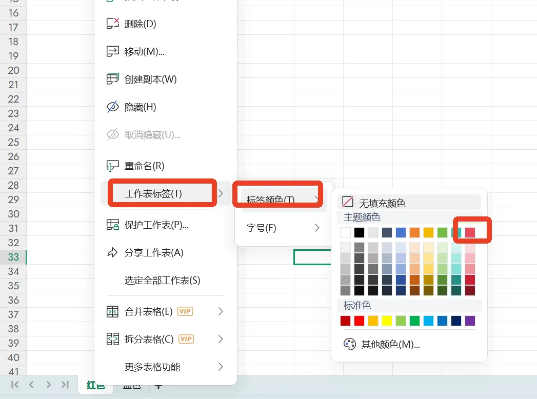 1、右键红色标签---工作表标签---标签颜色---选择红色